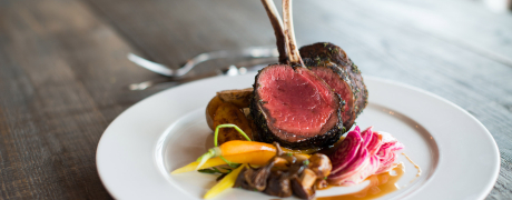 Carré de cerf du Québec rôti en croûte d’espresso et poivre de Penja, jus corsé au thym et légumes saisonniers